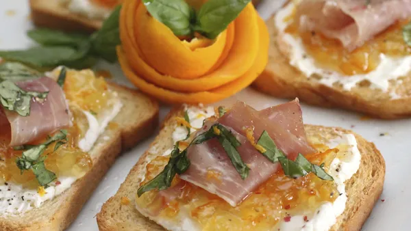 Step2Cut prosciutto into 1-inch strips. Place several strips of prosciutto over each wedge; push prosciutto into slits.
