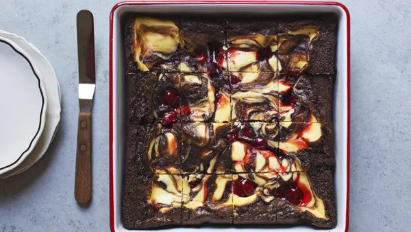 Step3Spread half of the batter (about 2 1/2 cups) in pan. Spread filling over batter. Carefully spread remaining batter over filling. Gently swirl through batters with knife for marbled design.