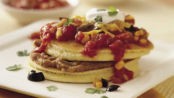 Step2In small bowl, mix salsa, corn and olives. Place 1 corn cake on each of 6 microwavable serving plates; spread each cake with generous 2 tablespoons beans. Top each with additional corn cake. Spread 1/3 cup salsa mixture over top of each cake stack. Sprinkle each serving with generous 1 tablespoon cheese.