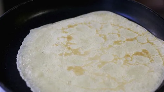 Step3If batter has separated, stir before using. Heat 6- to 7-inch or 9- to 10-inch skillet over medium-high heat. Wipe skillet with additional butter. To make crepe in small skillet, pour 3 tablespoons batter into pan (if using large skillet, use 1/4 cup batter). Immediately tilt and rotate skillet to spread batter over bottom surface. Cook until top surface is dry. Loosen edge with spatula; flip crepe over using fingers. Cook other side about 15 seconds. Turn crepe out of skillet onto clean kitchen towel to cool. Repeat with remaining batter, wiping skillet with butter as needed and stacking crepes as fried.