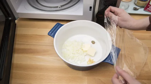 Step1In 2-quart microwavable casserole, place butter, onion, garlic, salt and pepper. Cover tightly; microwave on High about 3 minutes or until onion is soft. Add rice; stir to coat with butter. Cover; set aside.