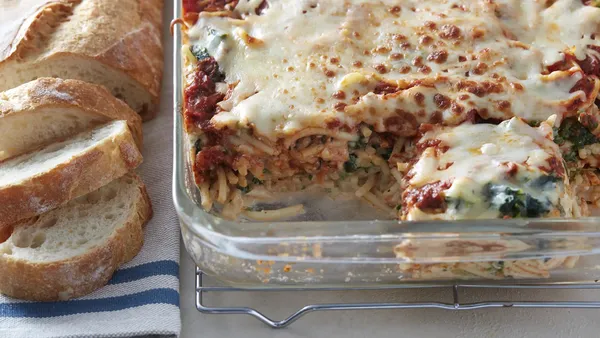 Step6Spread cheese mixture over spaghetti mixture in baking dish. Top with wilted spinach. Top with remaining spaghetti; sprinkle with remaining 1/2 cup mozzarella cheese.