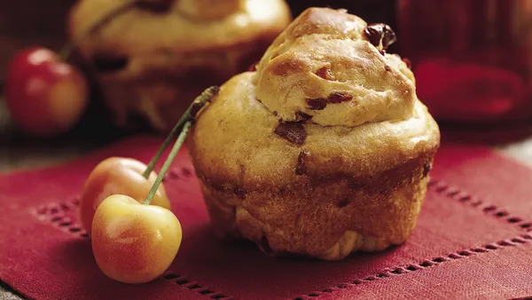 A sweet cherry glaze brings out the best of an almond and cherry muffin.