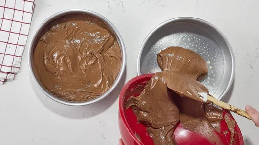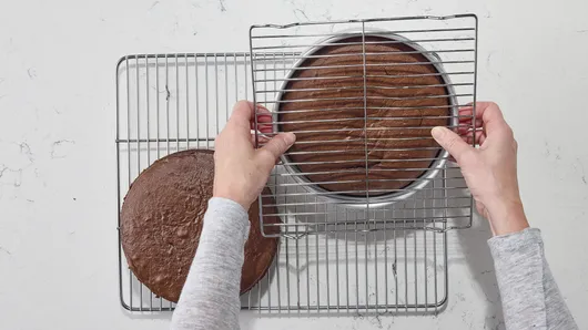 Bake the cakes on the center rack of an oven preheated to 350°F. Insert a toothpick or wooden skewer into the center of the cake to check for doneness. If it comes out clean, the cake is done. If there is batter or a few crumbs hanging on, bake the cake an additional couple of minutes or until it tests done. Remove baked cakes from the oven and cool on a cooling rack for 10 minutes. Remove cakes from pans and cool completely on cooling racks.