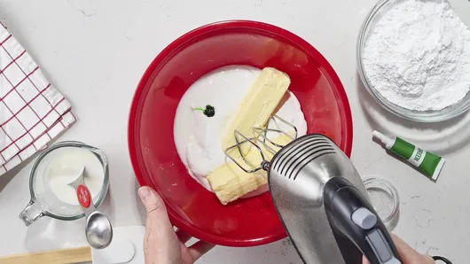 In a bowl, beat together the marshmallow creme, butter, mint extract, green food color, and a splash of milk with electric mixer. Beat in the powdered sugar until fluffy.