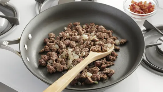 Step2Meanwhile, in 12-inch nonstick skillet, cook bacon over medium heat until crisp; with slotted spoon, transfer to paper towel-lined plate to drain. Pour off and discard all but 1 tablespoon drippings. Add beef, onion and seasoned salt to drippings in skillet; heat to medium-high heat. Cook 5 to 7 minutes, stirring frequently, until beef is brown and cooked through; drain.