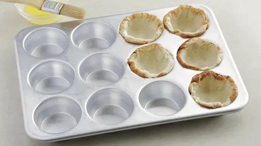 Step1Heat oven to 350°F. Brush 12 regular-size muffin cups with melted butter. Press half of a bun, cut side up, into each muffin cup, pressing to 1/4-inch thick; set aside.