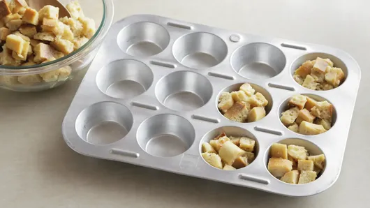 Step2In large bowl, beat eggs with whisk; beat in milk, brown sugar and salt. Add baguette pieces; toss to coat. Divide half of mixture evenly among muffin cups.
