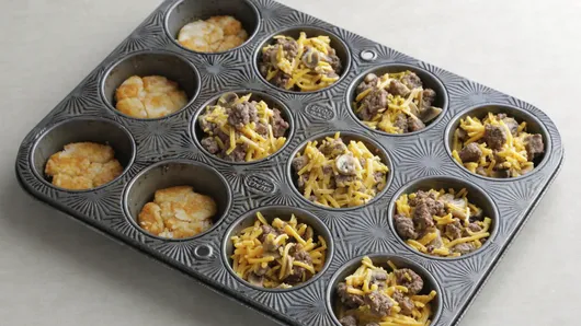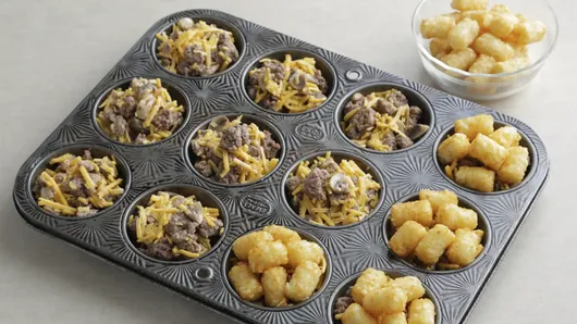 Place 6 frozen mini Tater Tots™ in each muffin cup; bake 20 minutes. Remove from oven; cool 5 minutes. Using 2 paper towels, press Tater Tots™ into cups to create a base for the hot dish and to absorb excess oil.