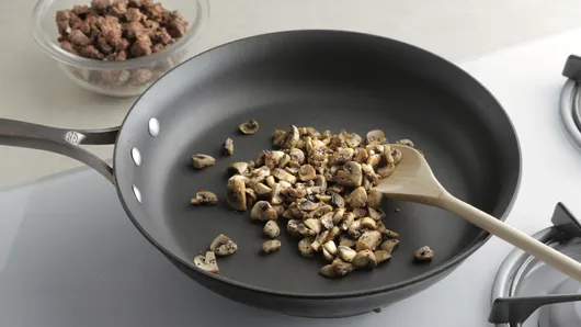 In 12-inch nonstick skillet, cook beef over medium-high heat 6 to 7 minutes, stirring frequently, until browned; drain. Remove from skillet; set aside. Wipe out skillet. Add mushrooms and steak seasoning to dry skillet; cook over medium-high heat 6 to 7 minutes, stirring frequently, until browned. Remove from heat; cool 2 minutes.