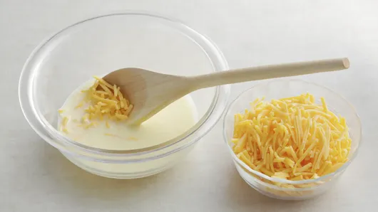 Meanwhile, in large bowl, mix milk and egg. Stir in cheese; set aside.