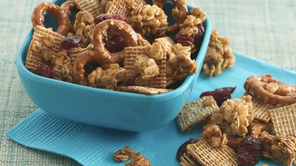 Mix up munchies in minutes! Whole-grain cereal and dried fruits are naturals.