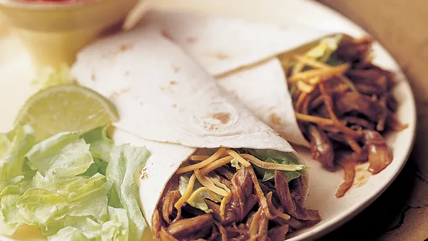 Step2Spoon filling on tortillas. Add toppings. Roll up tortillas.