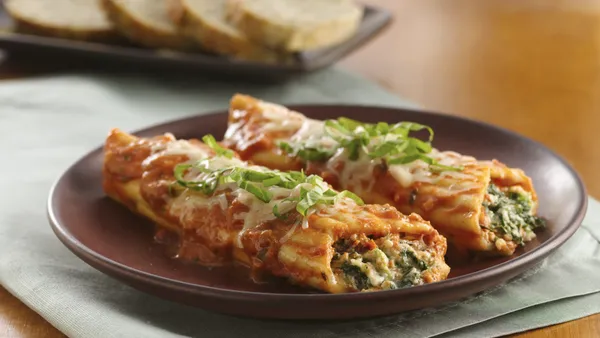 Step1Heat oven to 375°F. Cook and drain manicotti shells as directed on package.