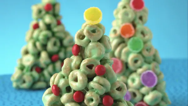 Step4Drop 1/3 cup of cereal mixture on waxed paper-lined cookie sheet. Use greased hands to form into wreath shape. Place 4 red cinnamon candies on wreath to decorate. Repeat with remaining cereal mixture and candies. Refrigerate 15 minutes before serving.