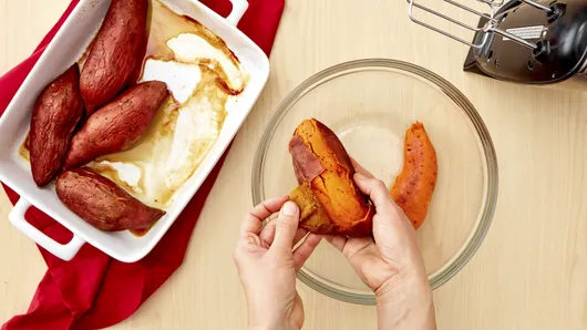 Let potatoes stand about 10 minutes or until cool enough to handle; slip off skins, and discard. Place cooked potatoes in large bowl. Mash with electric hand mixer at medium speed 1 to 2 minutes, until smooth.