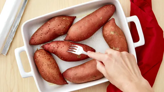 Heat oven to 350°F. Pierce potatoes with fork. Spray 13x9-inch (3-quart) baking dish with cooking spray. Place potatoes in dish and cover with foil; bake 1 hour 25 minutes to 1 hour 40 minutes, or until potatoes are very tender when pierced with a paring knife or fork.