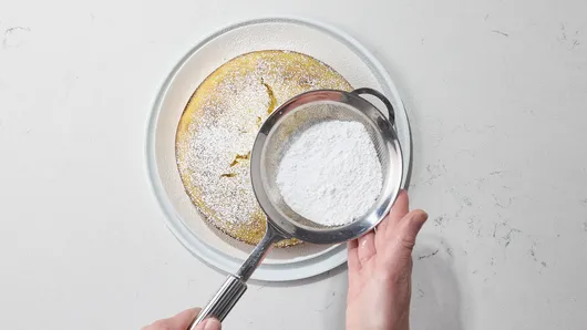 Step4Transfer cake to serving plate. Just before serving, sprinkle cake with powdered sugar. Top each slice with sweetened whipped cream and berries.