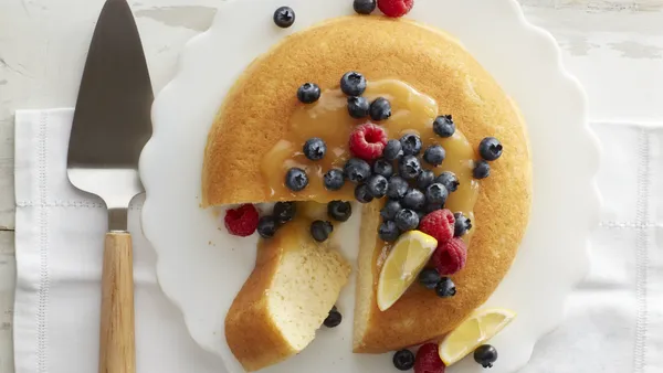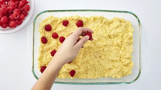 Step2In large bowl, beat cake mix, sour cream, melted butter, lemon juice, eggs and lemon peel with electric mixer on medium speed 2 minutes, scraping bowl occasionally. Pour in pan. Sprinkle raspberries on top.