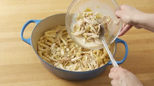 Step2In medium bowl, beat remaining can of evaporated milk and the cornstarch; stir in chicken and artichoke hearts. Add to mixture in Dutch oven; return to simmering, and continue to simmer 1 to 3 minutes or until thickened and mixture coats back of spoon.