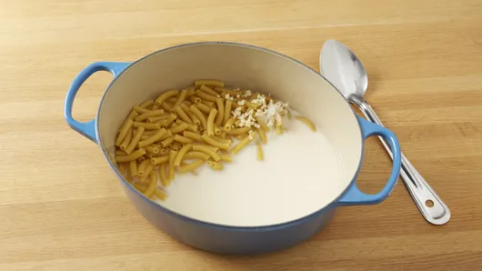 Step1In Dutch oven, heat water, 1 can of the evaporated milk, the salt, garlic and pasta to simmering over medium heat. Simmer 12 to 14 minutes, stirring frequently, until pasta is tender.