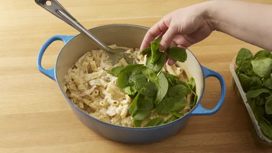 Creamy mac and cheese grows up with baby spinach, artichokes and Parmesan in this edgy version of everyone's favorite one-pot wonder.