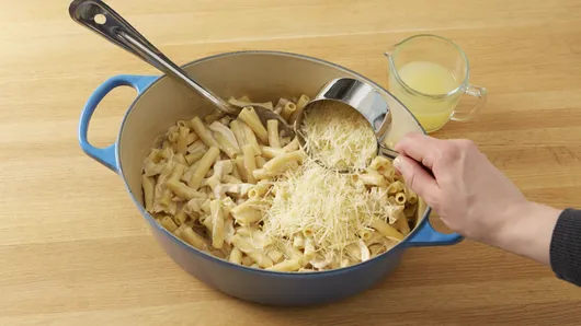 Step3Remove from heat; stir in half of the cheese and the lemon juice. Stir until cheese melts, then add remaining cheese (reserving 1/4 cup for serving, if desired) and butter; stir again.