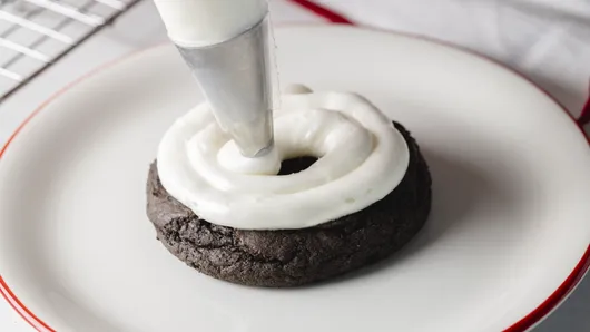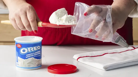 5. Frost: Once the cookies are completely cool, stir the room temperature frosting about 20 times for the right consistency. Take a decorating bag, and snip off about 1 inch from the tip. Place a round piping tip (we recommend a #804 tip with a 1/2-inch opening—different brands have different numbering, so use a ruler to double check) inside the bag, and push it down to the end. If needed, trim more of the bag so the tip fits snugly. Fold the opening of the bag halfway down, then spoon the frosting inside. Bring the ends together, twist, and gently squeeze the frosting toward the tip. Starting in the center of each cookie, pipe in a circular motion toward the edge, pulling up when you reach the outer rim. Finish with a sprinkle of OREO® Cookie crumbs for the final touch.