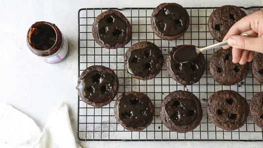 Step4In small microwavable bowl, microwave chocolate fudge topping uncovered on High 20 to 30 seconds or until thin and pourable. Spoon over warm cupcakes, reserving about 1/4 cup. Cool completely, about 20 minutes.