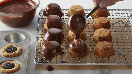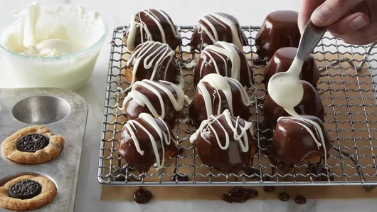 Step2Bake 10 to 12 minutes or until edges are golden brown. Cool in pan 10 minutes. Carefully run small knife around outside edge of cookie to loosen; remove to cooling rack. Cool completely, about 30 minutes. Place cooling rack of cookies over cookie sheet or waxed paper. Turn cookies over so bottom side is up and OREO™ mini side is down.