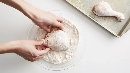 Roll the chicken pieces, one at a time, in the flour mixture until the chicken is coated on all sides. Shake off any excess flour mixture back into the bowl. Place the pieces skin-side-down in the melted butter in the pan.