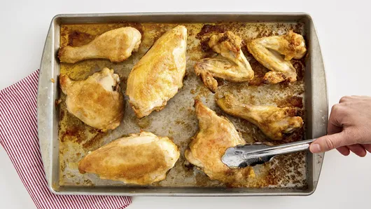 Use the Right Size Pan: Each piece of chicken needs enough room around it to crisp up and turn that irresistible golden-fried color and texture without being crowded by its neighbors. The pan we call for is known as a jelly roll pan. This is much larger and has shorter sides than a 13x9 pan. If you use a 13x9 pan, the moisture in the chicken gets trapped by the sides of the pan and the size crowds the pieces, which results in soft chicken exteriors.