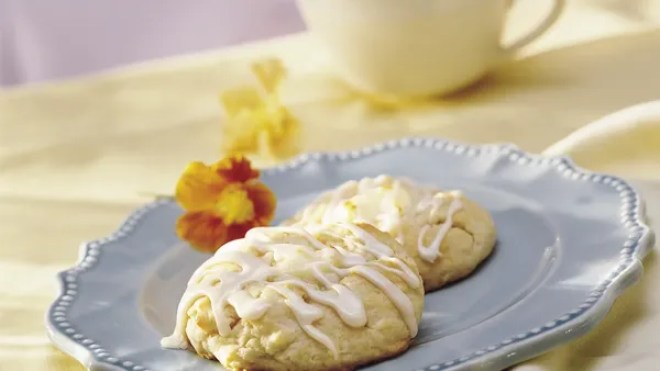 Step4Heat oven to 350°F. Make an indentation in center of each loop. Fill with 1/2 to 1 teaspoon jam. Brush dough again with egg whites. Bake about 15 minutes or until light golden brown. Remove from cookie sheet to wire rack (place rack on waxed paper to catch glaze drips).
