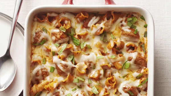Step2In ungreased 13x9-inch (3-quart) glass baking dish or lasagna pan, spread 1 cup of pasta sauce mixture. Top with 4 uncooked noodles, half of the ricotta cheese mixture, half of the mozzarella cheese, half of the feta cheese and all of the spinach.