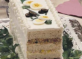 Step4To assemble ribbon sandwiches, place one slice white bread on cutting board. Spread 5 tablespoons cheese and olive filling over white bread. Top with 1 slice wheat bread; spread with 1/4 cup turkey filling. Top with 1 slice white bread; spread with 1/4 cup shrimp filling. Top with 1 slice wheat bread. Repeat process 3 more times to make a total of 4 sandwich stacks. Wrap each in plastic wrap; refrigerate at least 4 hours but no longer than 24 hours.