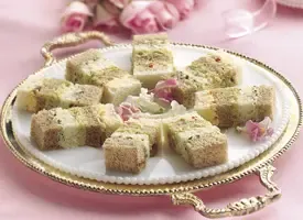 Step2Trim crusts from bread loaves. Cut each loaf horizontally into 4 equal slices. Lightly spread butter over 3 slices. Place 1 buttered slice on each of 2 serving plates or trays; spread each evenly with half of the shrimp salad spread. Top with second buttered slices; spread each evenly with half of the olive-nut spread. Top with third buttered slices; spread each evenly with half of the deviled ham spread. Top with unbuttered slices. Lightly press each loaf together.