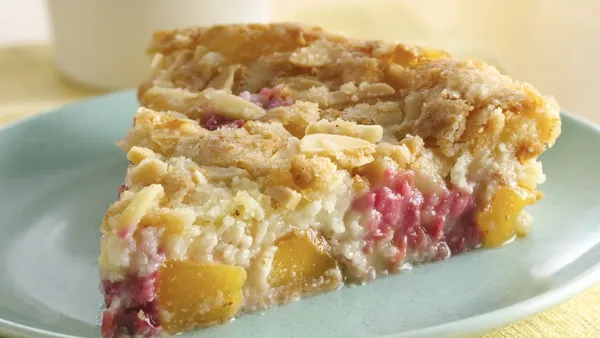 Step2On lightly floured surface, roll 1 pastry round into 13-inch round. Fold into fourths; place in 9-inch glass pie plate. Unfold and ease into plate; press against bottom and side. Trim pastry 1 inch from edge of plate. In small bowl, toss raspberries and 2 tablespoons flour. Fold into peach mixture. Spoon into crust-lined plate. Roll remaining pastry into 11-inch round; cut into 1-inchwide strips. Arrange strips in lattice pattern over filling; trim ends. Seal and flute. Brush with egg; sprinkle with turbinado sugar. Bake 30 to 35 minutes or until crust is browned and filling is bubbly.