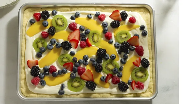 Betty Crocker® cake mix creates an easy press-in-the-pan crust for a scrumptious, fruity dessert pizza.