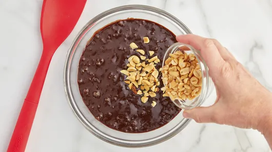 Heat oven to 350°F (325° for dark or nonstick pan). Grease bottom of 9-inch square pan with shortening or cooking spray. Make brownie batter as directed on box. Stir in 1/4 cup of the peanuts. Spread in pan.