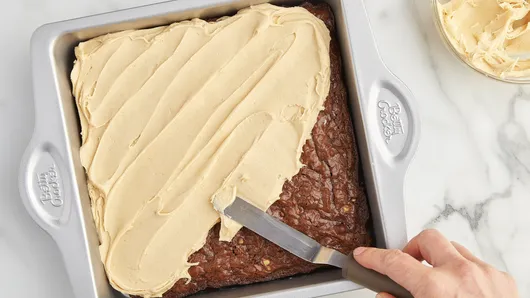 In small bowl, mix frosting and peanut butter until blended. Spread on top of brownie. Sprinkle remaining 1/4 cup peanuts over top.