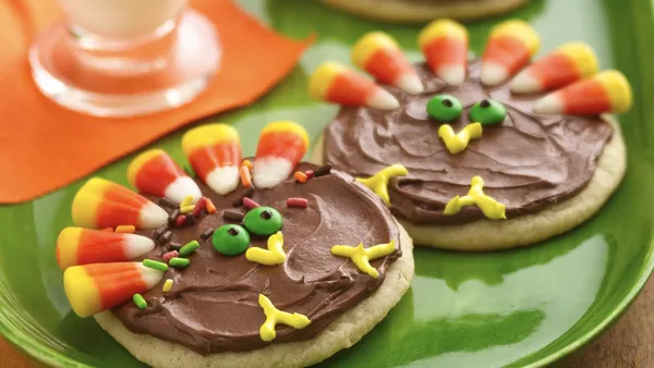 In small microwavable bowl, microwave chocolate chips uncovered on High 30 seconds. Stir; continue to microwave in 15-second intervals until chips can be stirred smooth. Spoon into resealable food-storage plastic bag; partially seal bag. Cut small tip from corner of bag; drizzle chocolate over top. Sprinkle candies over top.