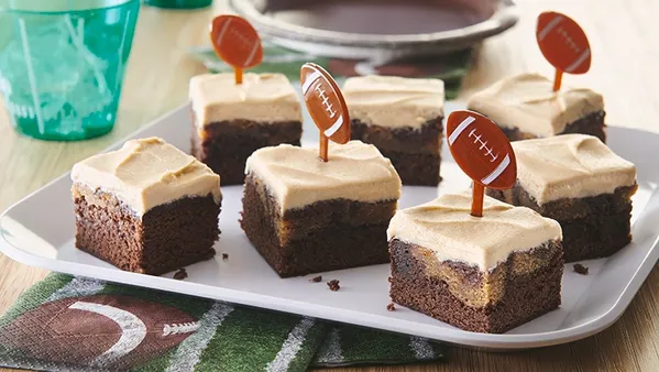 In small microwavable bowl, microwave peanut butter uncovered on High 25 seconds; stir until smooth. Drop 20 spoonfuls of peanut butter in 5x4 rows over brownie batter. For marbled design, pull knife through batter and filling about 1 inch apart; turn pan and repeat.