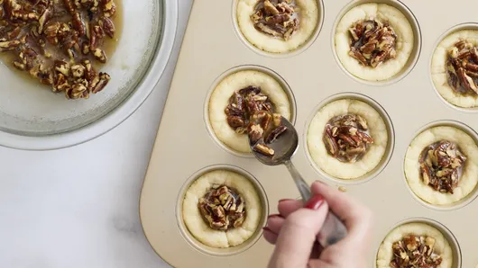 Reshape indentations in cookie cups, fill with pecan mixture, and bake until edges are golden brown.