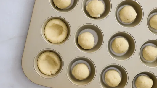 Shape dough into balls and place in greased and floured muffin cups. Use your thumb to make an indentation in the center.