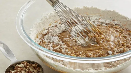 Step2In large bowl, beat brown sugar, eggs, pumpkin and oil with whisk until combined. In medium bowl, mix flour, cinnamon, ginger, nutmeg, baking soda, baking powder and salt until well blended. Stir flour mixture into sugar mixture until well blended. (Batter will be thick.) Stir in 1/2 cup of the nuts. Spoon and spread batter evenly into pans (about 1 1/2 cups batter in each pan).