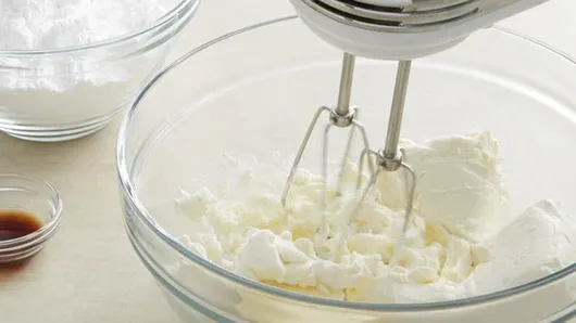 Step4In large bowl, beat cream cheese and butter with electric mixer on medium speed until smooth. Beat in vanilla until well blended. On low speed, beat in powdered sugar until frosting is smooth and creamy.