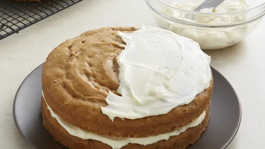 Step5Place 1 cake layer on serving plate. Frost top of layer with 3/4 cup of the frosting. Top with another cake layer and 3/4 cup of the frosting. Top with remaining cake layer and frosting. Sprinkle with remaining 1/2 cup nuts. Store covered in refrigerator.