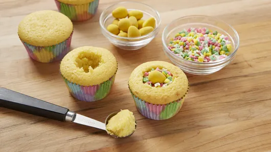 Step3Using melon baller, scoop out center of each cupcake, about 1 inch deep. Fill each with 1 heaping teaspoonful candies.