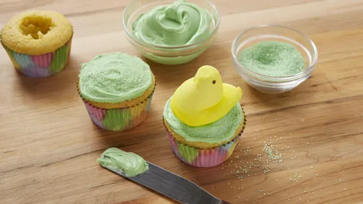 Step4Spoon frosting into medium bowl; stir in enough food color until desired green color. Frost cupcakes with frosting; sprinkle with colored sugar. Top with yellow PEEPS® chick. Store loosely covered.