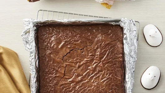 Step1Heat oven to 350°F (325°F for dark or nonstick pan). Line 9-inch square pan with foil, leaving extra hanging over sides of pan; spray bottom only with cooking spray. Make brownie batter as directed on box. Spread batter in pan. Bake 36 to 38 minutes or until toothpick inserted 2 inches from side of pan comes out almost clean.